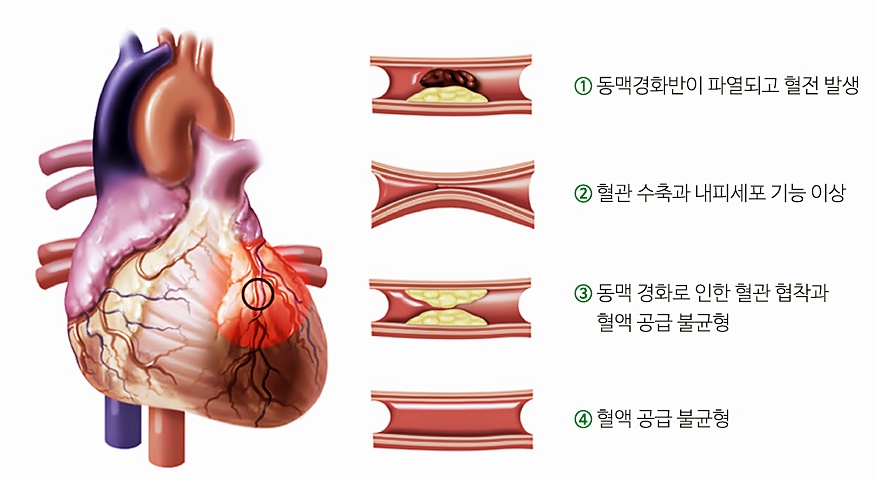 심장은 3개의 주요 혈관(관상동맥)을 통해 산소와 영양분을 공급받아 작동해요. 동맥경화증, 혈전증, 혈관수축, 연축으로 인해 3개의 관상동맥 중 어느 하나에 급성 또는 만성 협착증이 발생하게되면 심장 전체 또는 일부에 산소와 영양분 공급이 떨어지고 심장으로의 공급이 감소해요.